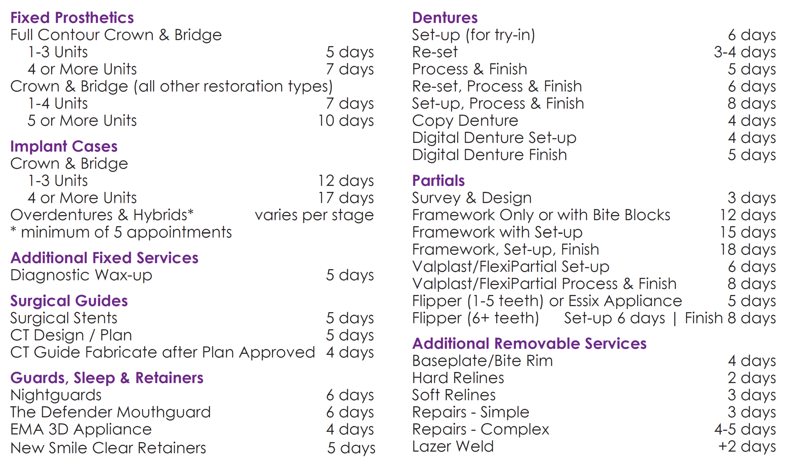 In order to deliver quality restorations, New Image needs adequate time to fabricate, inspect and deliver your work. The turnaround times refer to full working days in lab; Monday thru Friday. Shipping, pick-up and delivery days are not considered working days. Rush cases outside our normal turnaround time incur a 25% fee of the cost of the case.